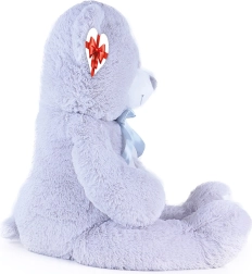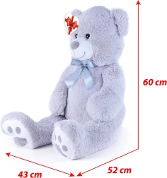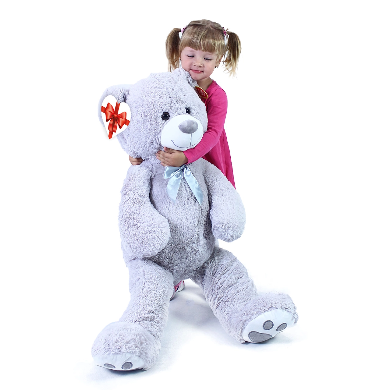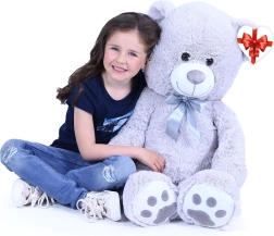 Gran oso de peluche gris de unos 100 cm de largo que encanta por su suavidad, carácter achuchable y acabado de calidad. Su superficie aterciopelada invita a abrazarlo, el lazo de satén aporta un toque elegante y la etiqueta en forma de corazón permite añadir un mensaje personal: ideal para cumpleaños, festividades o como decoración del cuarto infantil.