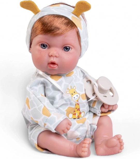 La muñeca viste un adorable conjunto de jirafa, complementado con una diadema con pequeñas orejitas amarillas y un chupete, lo que realza su aspecto realista.