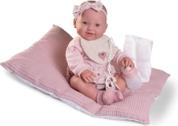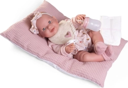 El paquete incluye un biberón rellenable con agua y dos pañales desechables. Todo el set se presenta cuidadosamente en una caja de regalo, convirtiéndolo en un obsequio perfecto para cualquier ocasión. La muñeca de 42 cm es ideal para niños a partir de 3 años, y fomenta el juego creativo y el cuidado.