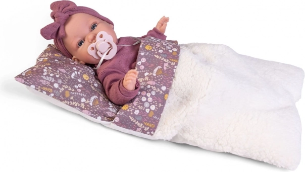 Muñeca-bebé española hecha a mano con cuerpo de tela blando y extremidades de vinilo suavizado, que encanta por su aspecto realista y la función de balbuceo al presionar la barriguita. Su tamaño compacto de 34 cm, el enfoque respetuoso de la marca con la naturaleza y el empaque para regalo la convierten en un gran obsequio para niños a partir de 3 años.