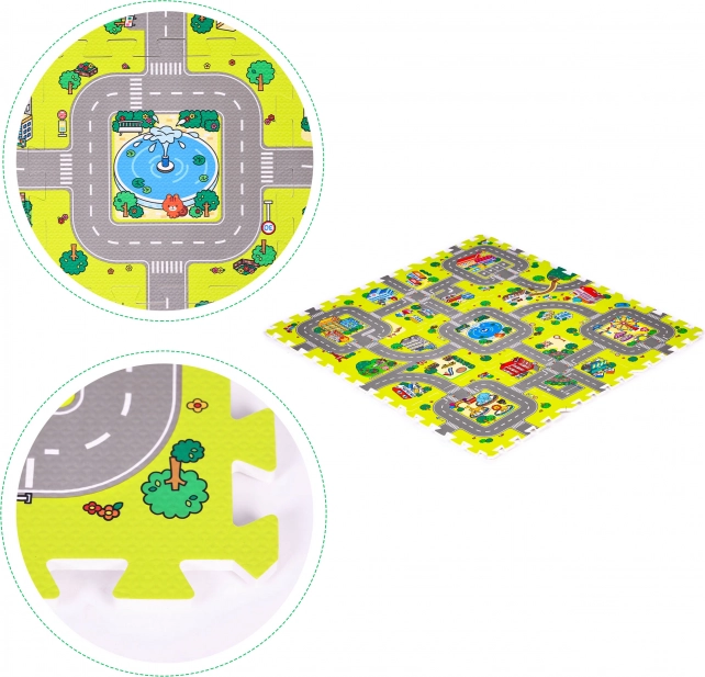 La impresión colorida con carreteras, edificios y parques estimula la imaginación. Los niños ejercitan la motricidad fina y gruesa y, al jugar con cochecitos, aprenden a orientarse en el espacio.