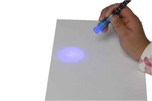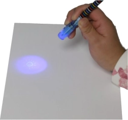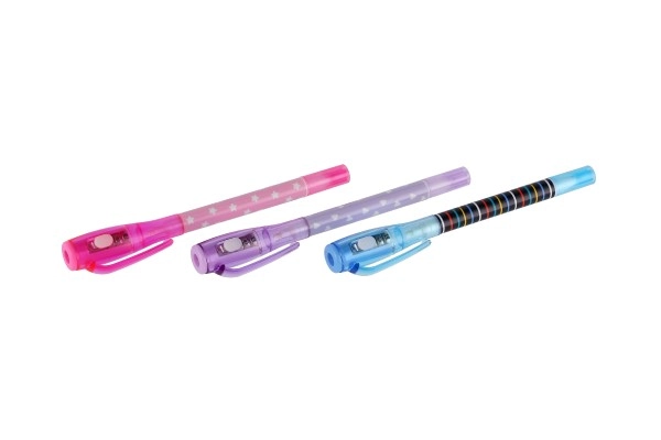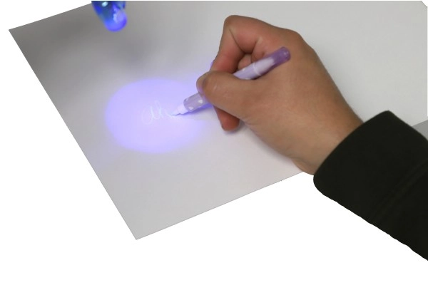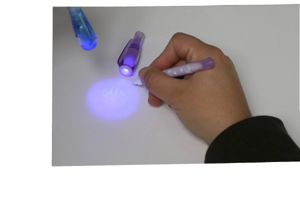 Tinta invisible visible solo bajo la lámpara UV del tapón del bolígrafo. Genial para mensajes secretos y juegos de espías.