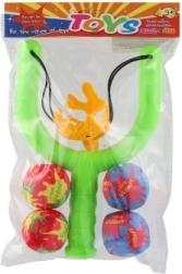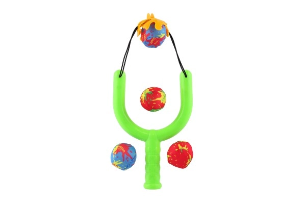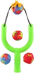 El set incluye 4 bombas de agua coloridas y un tirachinas de plástico resistente con cazoleta elástica para disparos cómodos y seguros.