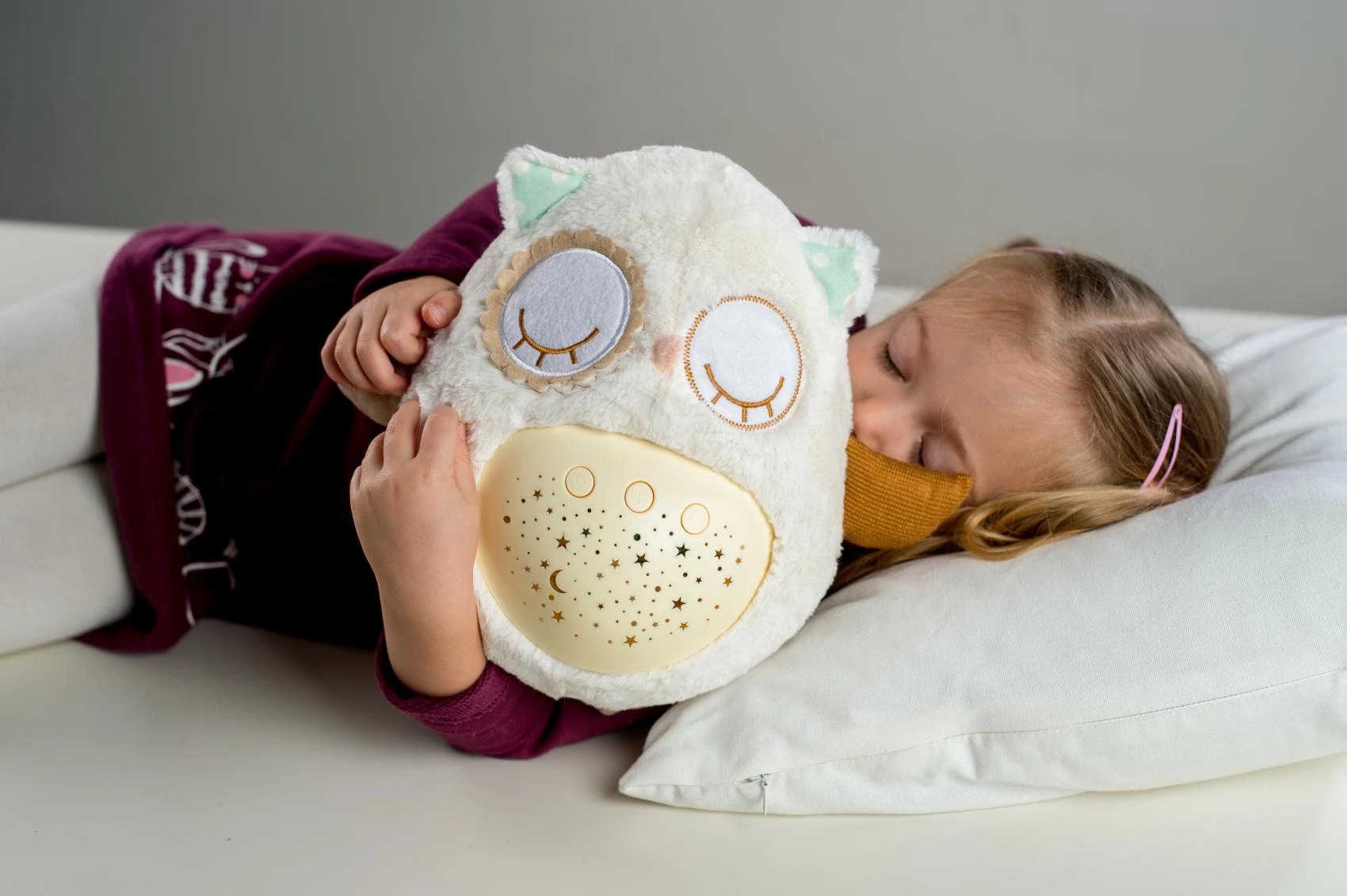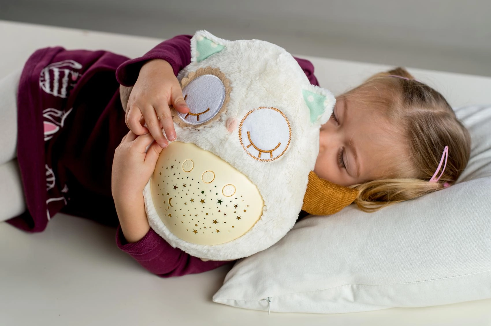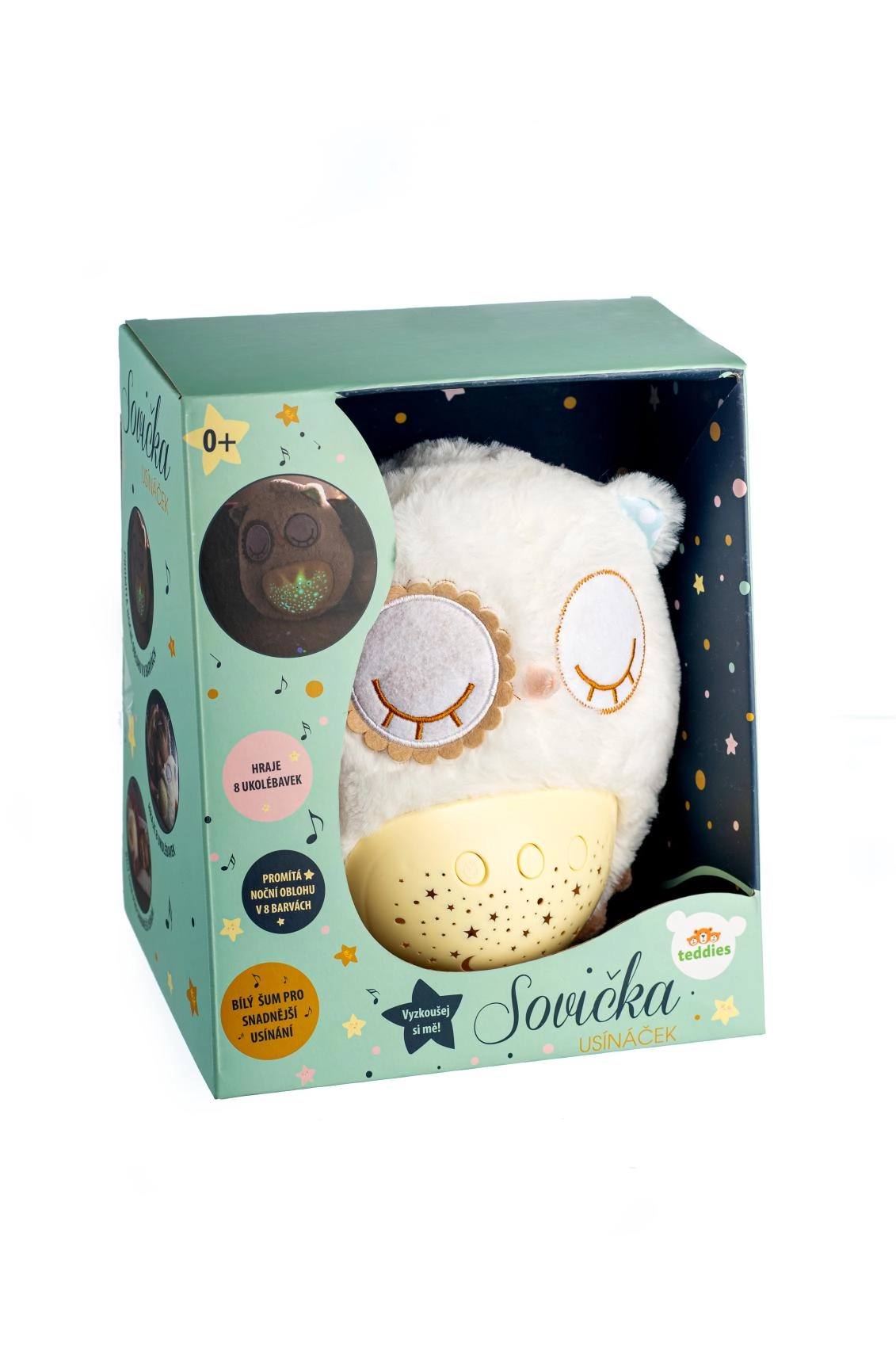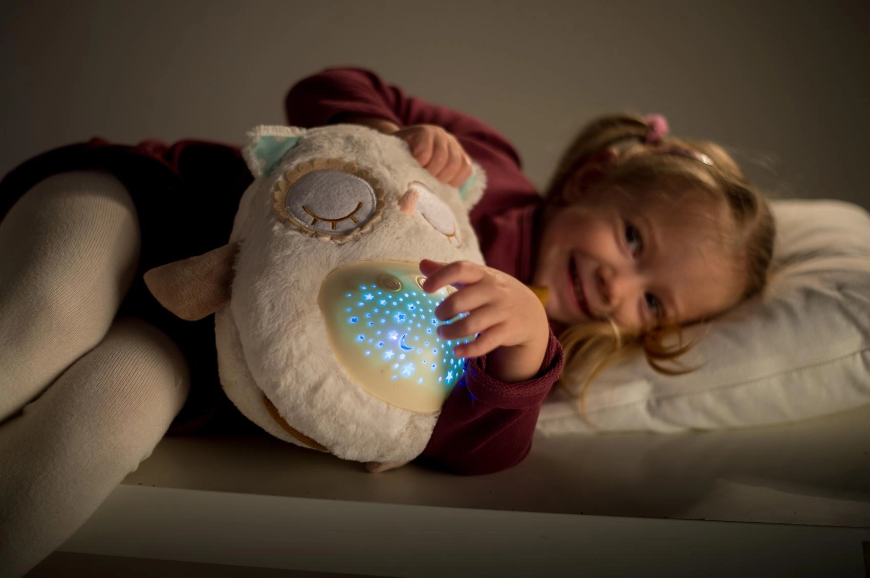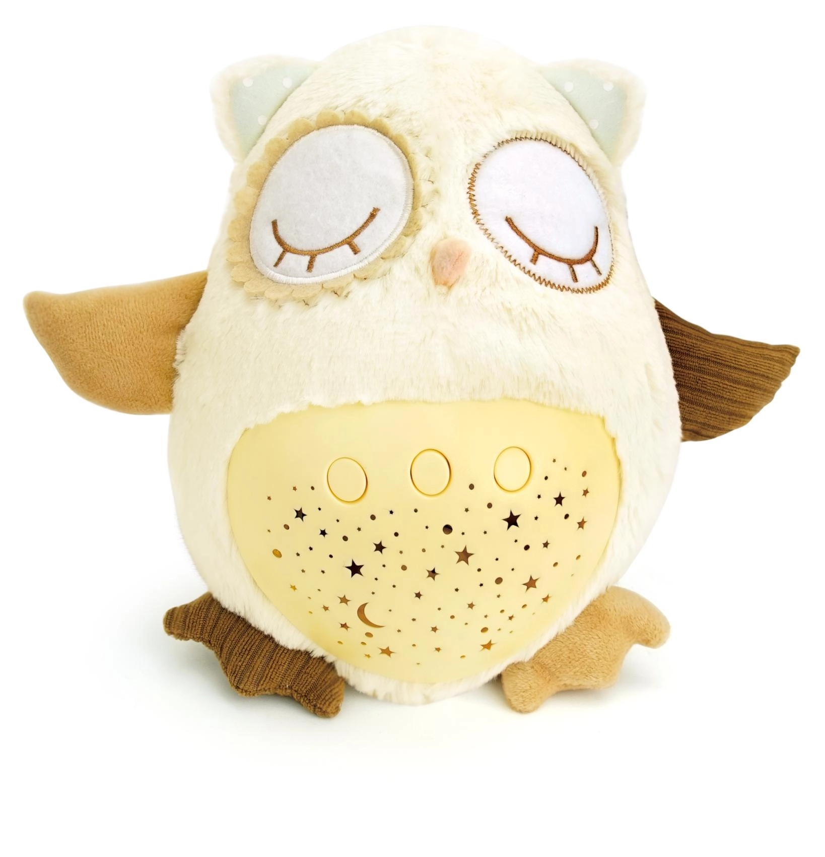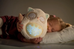 Este suave doudou de peluche combina un abrazo cálido con funciones inteligentes para dormir. El buhito proyecta un cielo estrellado en 8 colores, reproduce 8 nanas y sonidos prenatales relajantes a los que los más pequeños están acostumbrados desde el vientre de mamá. Tras terminar la melodía, la luz permanece suave durante aprox. un minuto y luego se apaga automáticamente.