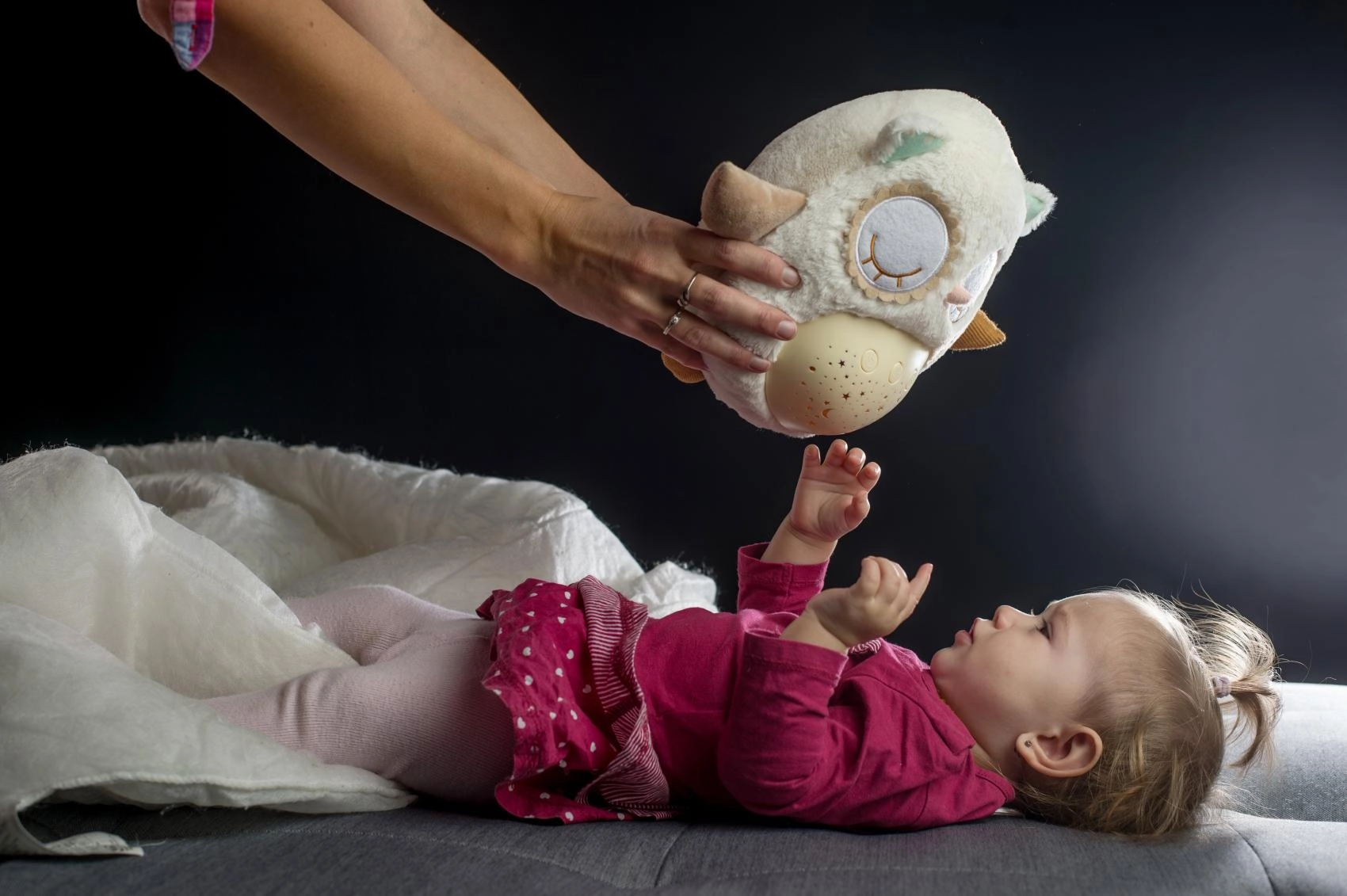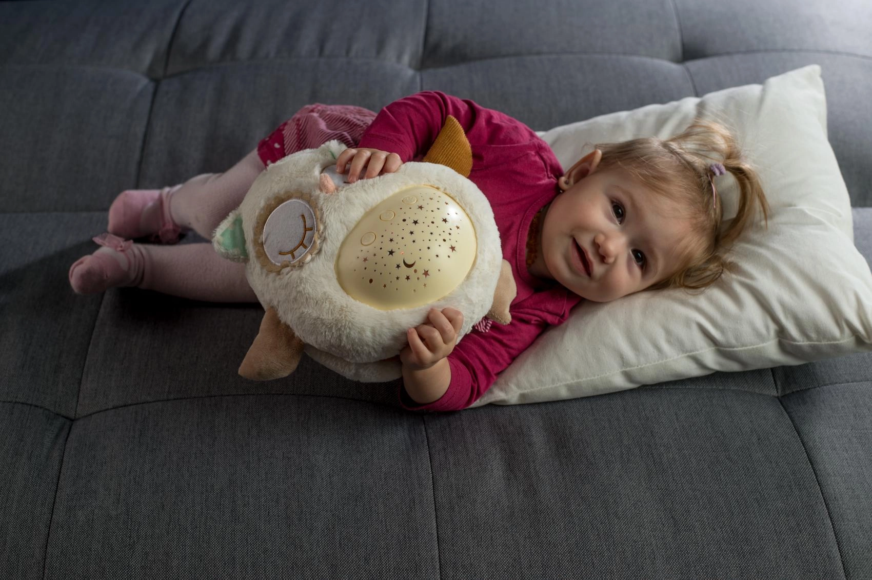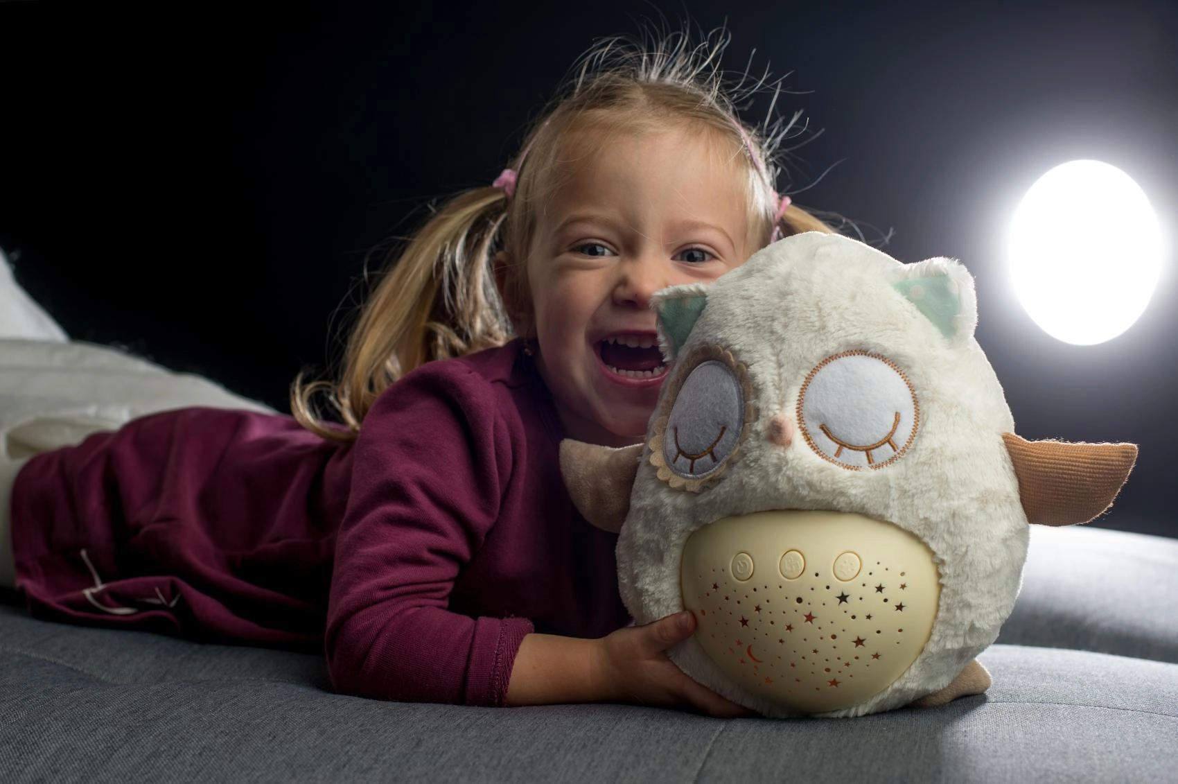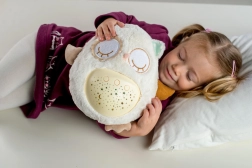 El manejo es sencillo gracias a los botones en la barriguita, por lo que puedes ajustarlo incluso a oscuras. Gracias a su tamaño compacto, el buhito es ideal para la cuna y para llevar de viaje. El material suave y agradable invita a los mimos y ayuda a crear un tranquilo ritual nocturno.