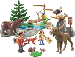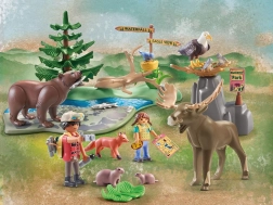 - Contenido amplio: 2 figuras humanas (hombre aprox. 7,5 cm, niña aprox. 5,25 cm), oso grizzly, águila calva, alce, zorro, 2 marmotas, 3 arenques, ave, base con río, conífera, poste direccional, cámara de fotos, prismáticos.