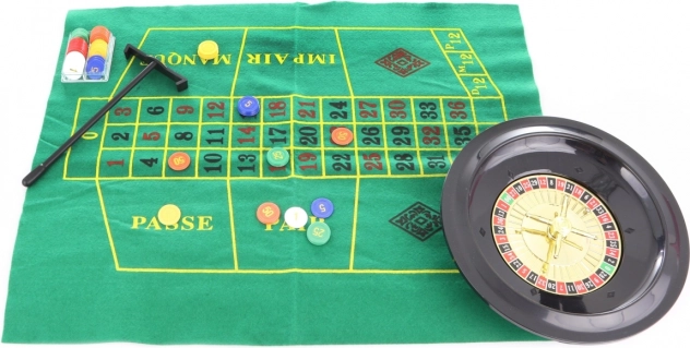 - Ruleta, tapete, rastrillos, 2 bolas metálicas, 60 fichas de colores, reglas del juego