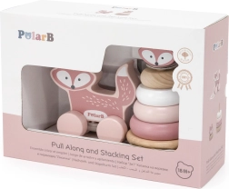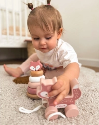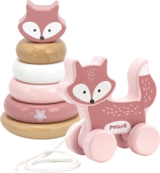 Este set incluye dos juguetes favoritos: una torre apilable con zorro, que enseña a ordenar los aros por tamaño y color, y un zorro de arrastre con cuerda, que motiva a caminar y moverse de forma divertida. La combinación de ambos favorece el aprendizaje natural a través del juego.