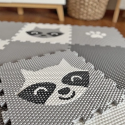Esta alfombra de espuma de alta calidad, compuesta por piezas conectables, crea un espacio de juego seguro y confortable. Su diseño gris claro neutro con un tierno mapache encaja en cualquier interior y hace que el tiempo en el suelo sea más agradable para los niños. Las piezas encajan con precisión, por lo que puedes ampliar o adaptar la alfombra fácilmente.