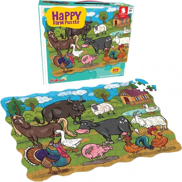 El rompecabezas Granja Feliz ofrece a los niños una diversión creativa e inteligente mientras ensamblan 208 piezas con un motivo de granja y sus habitantes.