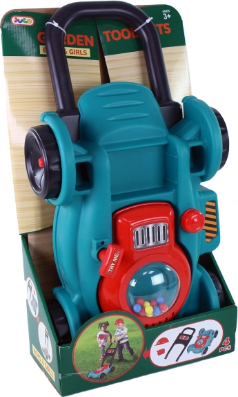 Este cortacésped de jardín para niños es el complemento perfecto para todos los pequeños entusiastas de la jardinería. Está fabricado en plástico resistente con una atractiva combinación de colores turquesa y rojo. Al moverse, el cortacésped emite sonidos que imitan el corte real del césped, ofreciendo a los niños una experiencia auténtica.