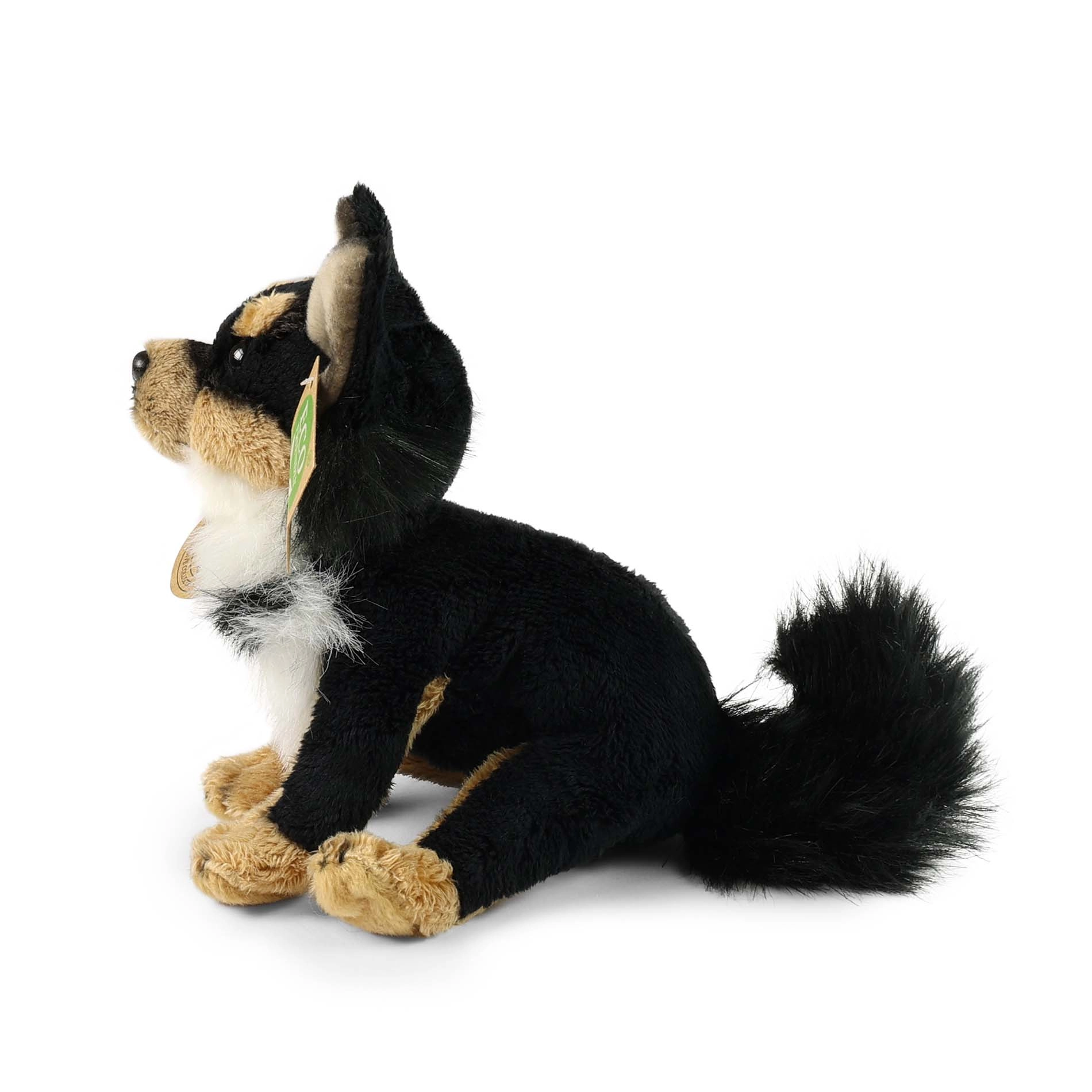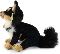 Adorable chihuahua de peluche de 15 cm que encantará a niños y adultos. Está hecho de un peluche de alta calidad y suavidad, con acabado realista, elaboración artesanal y relleno eco de botellas PET recicladas. Ideal como primera mascota de peluche para los más pequeños: seguro desde 0+.