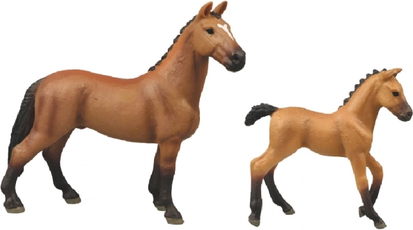 Set ideal para amantes de los caballos que incluye una figura de caballo y un potrito en un impresionante color marrón con mancha blanca, complementado con un cercado.