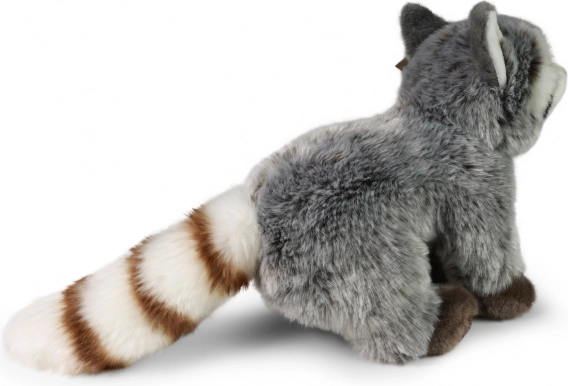 El mapache de peluche presenta detalles como la cola a rayas y patrones de pelaje en contraste que realzan su aspecto realista.