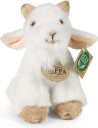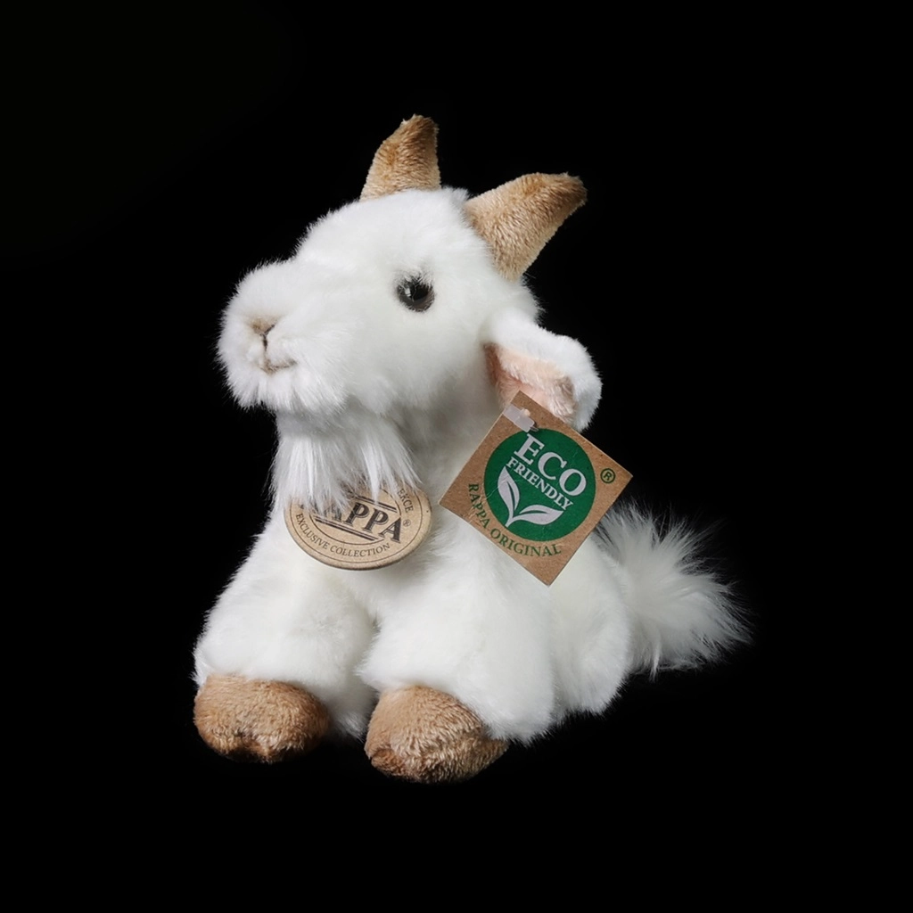 Cabra de peluche de 16 cm perfectamente realista, confeccionada con peluche de alta calidad y tacto suave. Forma parte de una colección exclusiva de juguetes que apuesta por el relleno eco-friendly hecho con materiales reciclados.
