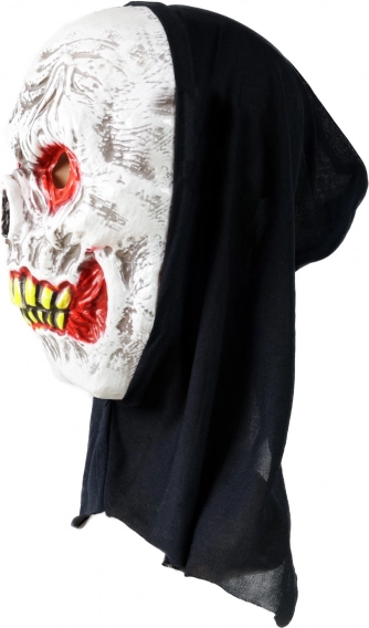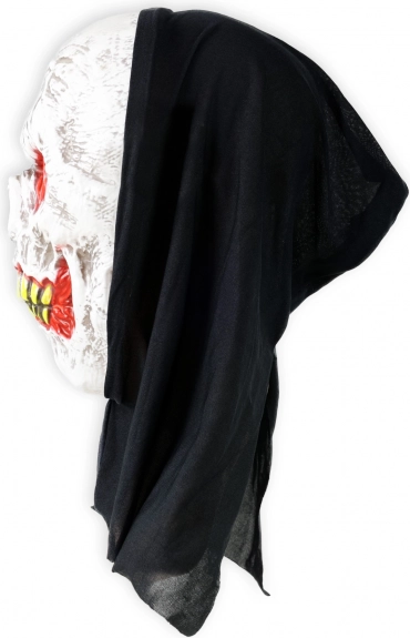 Esta máscara de calavera con pañuelo/capucha negra transformará tu disfraz en un instante. El contraste en blanco con contornos rojos en los ojos y dientes amarillos resalta el aspecto terrorífico, que luce de maravilla en fotos y también en la oscuridad bajo las luces de la fiesta.