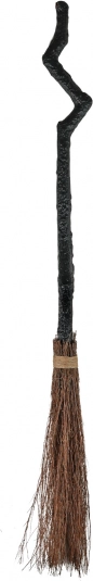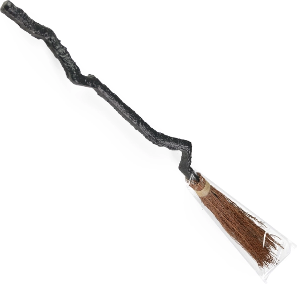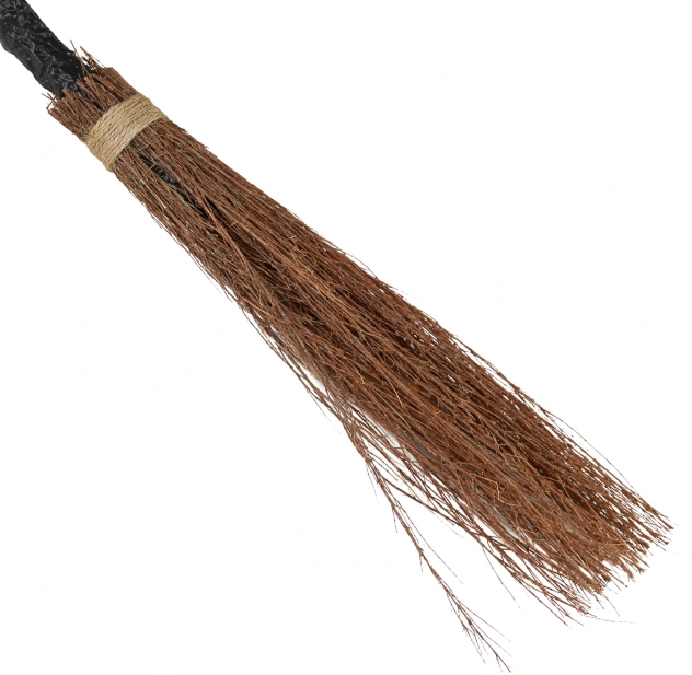 La escoba con mango negro y parte de barrido marrón recuerda a un clásico accesorio de bruja.