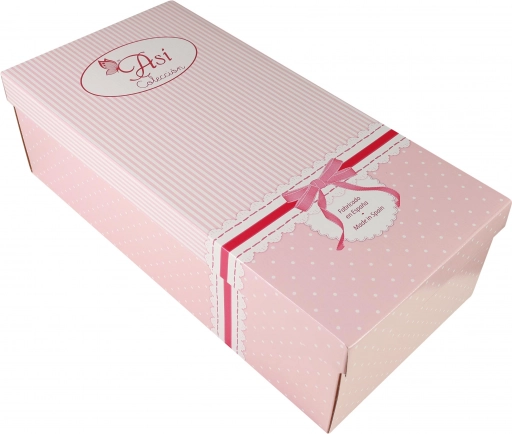La muñeca María de la marca familiar ASI se fabrica en España con énfasis en la calidad y la seguridad. Su cuerpo totalmente de vinilo es duro y firme, pero agradable al tacto y perfectamente moldeado en todos los detalles, incluida la anatomía. El aspecto realista se realza con los ojos azules fijos y las finas pestañas.