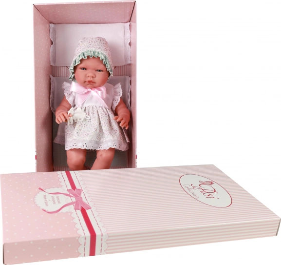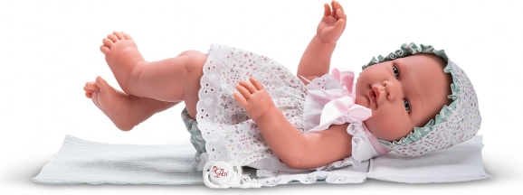La muñeca va elegantemente vestida con un vestido blanco de encaje y gorrito, y viene con un cojín, una mantita y un chupete con cadena que puede colocarse en la boquita. Perfecta para el juego de roles; desarrolla la empatía, la motricidad fina y la imaginación.