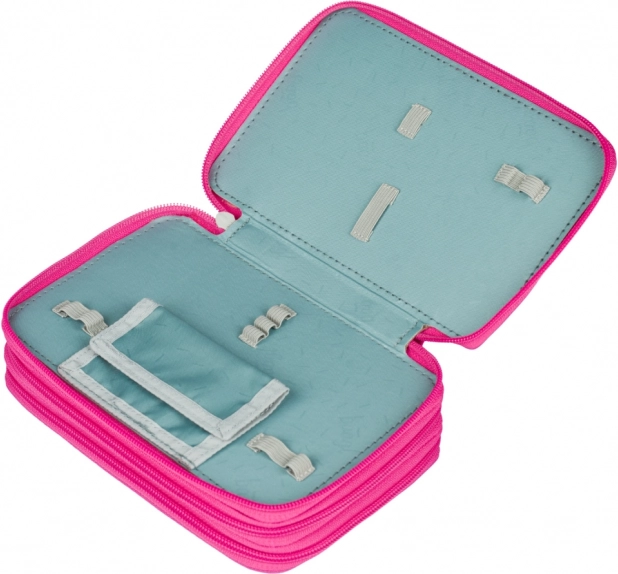 Este estuche escolar de tres pisos con motivo tropical de flamencos y hojas de colores ofrece no solo estilo, sino sobre todo funcionalidad para organizar todo tu material de escritura. Cada compartimento utiliza cremalleras fiables de la marca YKK y el lomo reforzado facilita la manipulación al cerrar.