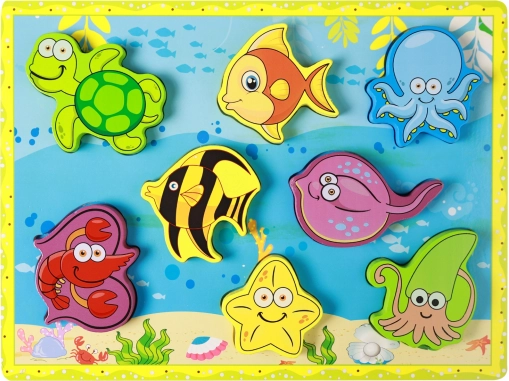 Descubre la magia del mundo submarino con este rompecabezas de encaje de madera de calidad para los más pequeños. Las piezas de colores con animales marinos fomentan el reconocimiento de formas y colores, desarrollan la motricidad fina y la coordinación ojo–mano, mientras el niño entrena de forma divertida la concentración y el pensamiento lógico.