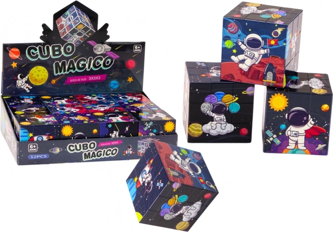 El cubo mágico está diseñado con colores alegres e ilustraciones amigables para resultar fascinante y divertido para los pequeños amantes de la astronomía. El objetivo es completar una imagen con motivos como astronautas y planetas, lo que estimula su creatividad.