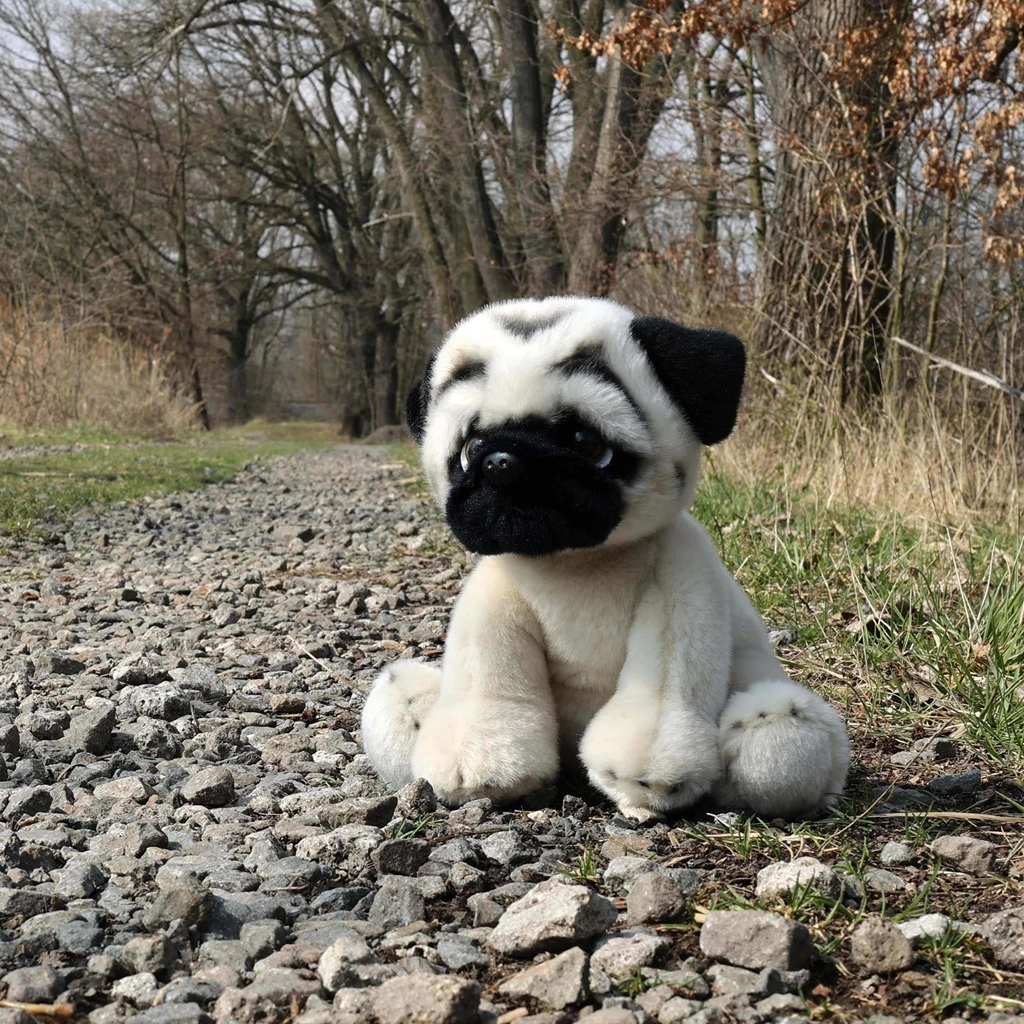 Este suave perro carlino de peluche encantará a pequeños y grandes amantes de los animales. Los detalles realistas del rostro, las orejas negras y el pelaje suave crean una apariencia realista que te enamorará al primer toque. El juguete está cosido con énfasis en la calidad y la durabilidad para soportar los abrazos de cada día.