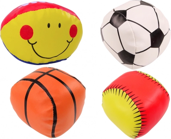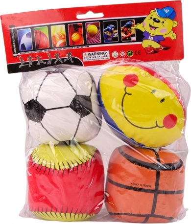 Divertido juego de 4 pelotas suaves para niños que ofrece juego seguro y aprendizaje de distintos deportes: fútbol, baloncesto, béisbol y rugby. Cada pelota es suave y segura, ideal incluso para los deportistas más pequeños. La práctica bolsa transparente facilita llevarlas al campo, al parque y de excursión. Excelente para el desarrollo de la motricidad, la coordinación y el trabajo en equipo.