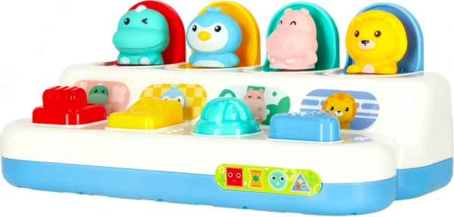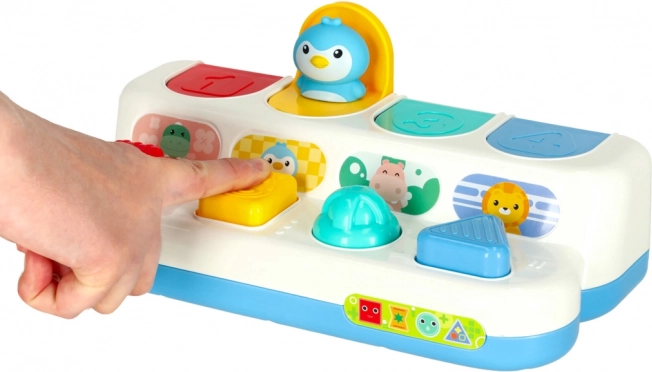Este juguete emergente interactivo une el aprendizaje con el juego. Los niños descubren colores, formas y números mientras practican la concentración y el pensamiento lógico. Cada panel tiene un mecanismo diferente —presionar, deslizar o girar— y, tras la acción correcta, aparece un tierno animalito. El característico “clic” favorece la percepción auditiva.