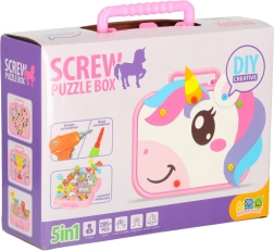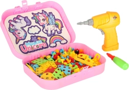 Juego de construcción portátil con motivo de unicornio en un práctico maletín rosa que incluye 285 piezas para crear obras en 2D y 3D. Los niños disfrutarán atornillando con una taladradora a pilas y un destornillador, desarrollando la motricidad fina, la creatividad y la paciencia. El maletín compacto con asa es ideal para viajes y para guardar todo en orden.