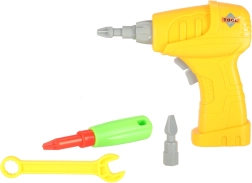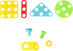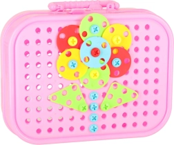 Este mosaico creativo combina piezas de colores, tornillos y herramientas para que los niños puedan componer patrones, animales y sencillos modelos 3D. La taladradora eléctrica a pilas y el destornillador convierten el juego en una auténtica aventura de bricolaje y fomentan la coordinación mano-ojo.