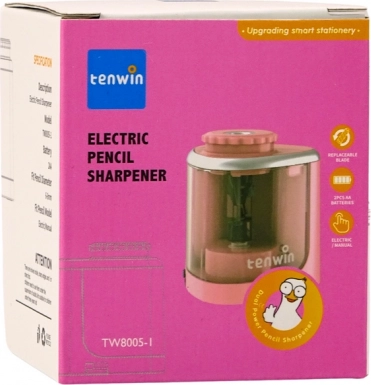 Compacto y elegante sacapuntas rosa TENWIN para lápices y crayones de 6–8 mm, ofrece un afilado rápido y preciso en casa, en la escuela y en la oficina. Gracias a la opción de modo eléctrico y manual, al cuchillo intercambiable (incluye repuesto), al depósito transparente para las virutas y al bloqueo de seguridad de la tapa, su uso es sumamente cómodo. Funciona con 2× AA pilas (no incluidas).