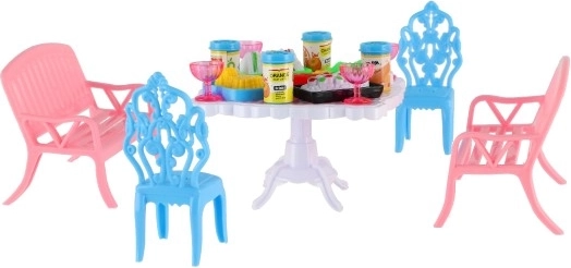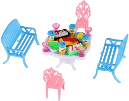 El set incluye 2 bancos, 2 sillas y una mesa, junto con 13 piezas de accesorios: vasitos, latas, platos y una bandeja. Todo lo necesario para el banquete de tus muñecas.