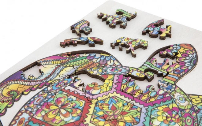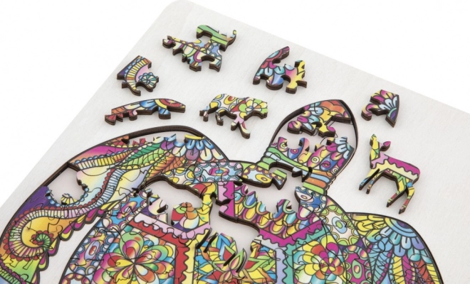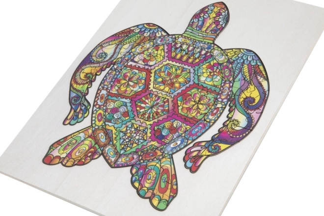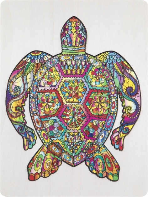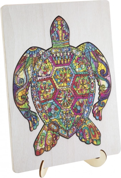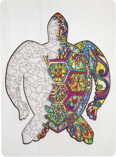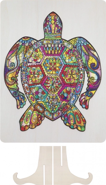Rompecabezas de contorno de madera con forma de tortuga con piezas de formas variadas, ideal para niños y adultos. Incluye piezas con forma de animales y objetos, lo que añade atractivo y diversión.
