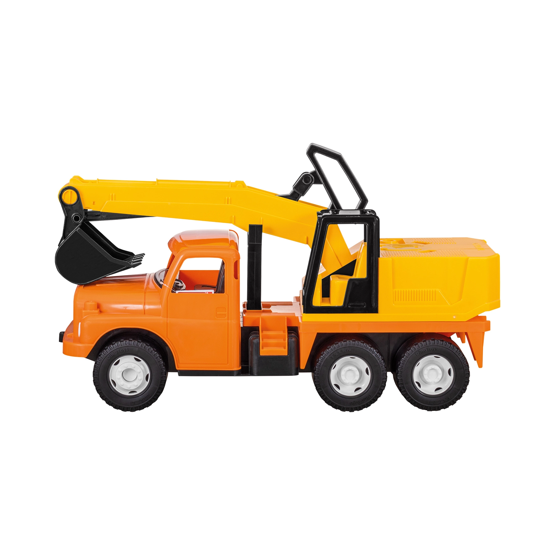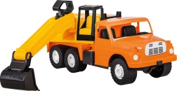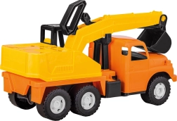 Este modelo está fabricado en plástico resistente, lo que permite una limpieza fácil con agua después de cualquier juego en terreno embarrado. El diseño naranja-amarillo de la excavadora es atractivo tanto para niños como para niñas.