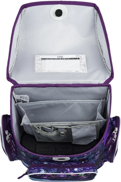 El organizador interior, el bolsillo transparente con el horario y el bolsillo frontal aislado mantienen la merienda y el material ordenados y seguros.