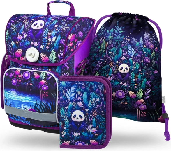 Un elegante set escolar para los primeros cursos de primaria con motivo de panda que incluye una cartera ergonómica ERGO, un estuche de un piso y una bolsa práctica para zapatillas o educación física. La cartera ofrece un sistema de espalda deslizante, cierre magnético Fidlock, elementos reflectantes y materiales resistentes e impermeables para un uso diario seguro y cómodo.