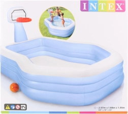El centro de juego con aro de baloncesto integrado y pelota ofrece una gran combinación de diversión acuática y actividad física. Sus amplias dimensiones de 257 × 188 × 130 cm y capacidad de 682 l (con altura de agua de 32 cm) garantizan espacio suficiente para niños a partir de 3 años.