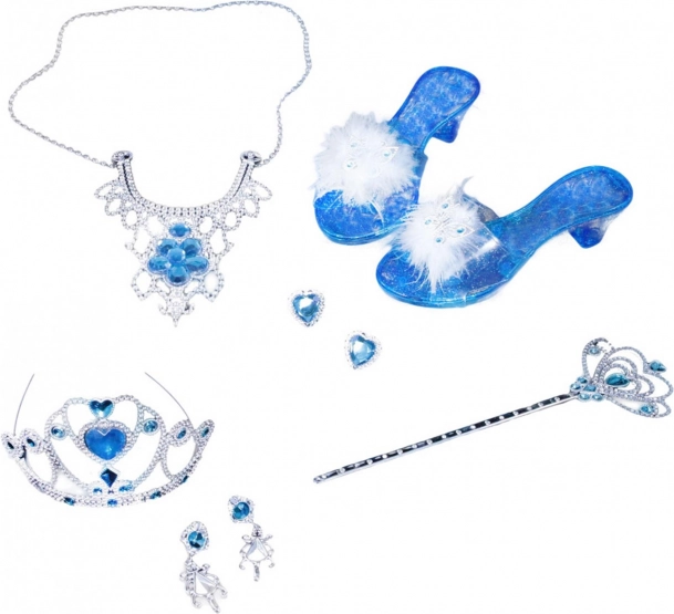 Conviértete en una princesa de invierno con este precioso set de accesorios, que incluye zapatitos de lujo, una hermosa corona, un cetro, y un deslumbrante collar con pendientes y anillo.