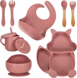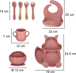 ¿Busca un equipo seguro y práctico para las primeras comidas autónomas? Este juego de silicona de 9 piezas en color rosa oscuro combina un diseño divertido con máxima funcionalidad. El plato en forma de ardilla con 3 compartimentos mantiene cada alimento por separado; el bol y el plato tienen ventosas fuertes para mayor estabilidad en la mesa y para minimizar el desorden.