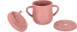 El bol con ventosa se fija firmemente a la mesa; el vaso con dos tapas y pajita sirve como tacita y también como recipiente para tentempiés: menos desorden, más comodidad.