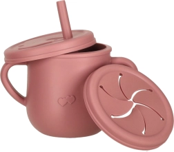 El vaso con dos tapas y pajita sirve como tacita infantil y como contenedor para tentempiés; el babero con bolsillo profundo atrapa migas y bocados derramados. Todas las piezas están hechas de silicona segura sin BPA, agradable al tacto, con bordes suaves y fácil limpieza, incluso en el lavavajillas.