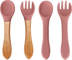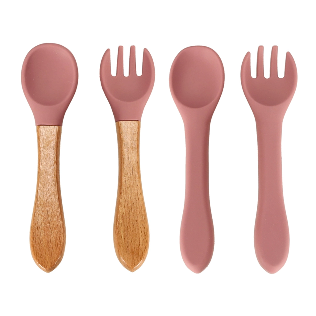 - Materiales seguros: silicona de grado alimentario sin BPA, mangos de madera en los cubiertos.