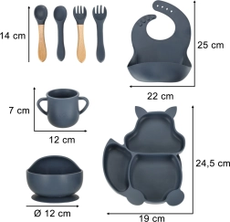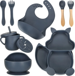 Completo juego de comedor de silicona de 9 piezas para niños con motivo de ardilla en color azul oscuro. Incluye plato dividido, cuenco con ventosa, taza con dos tapas y pajita, babero y cubiertos suaves. Es sin BPA, resistente y fácil de limpiar en el lavavajillas, ideal para los comienzos de la alimentación autónoma con ventosas antideslizantes.