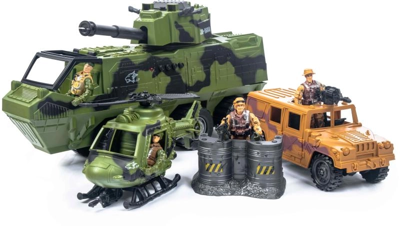 El set incluye un transporte blindado, un helicóptero y un jeep: la combinación ideal para transporte de unidades, reconocimiento aéreo y desplazamientos rápidos.