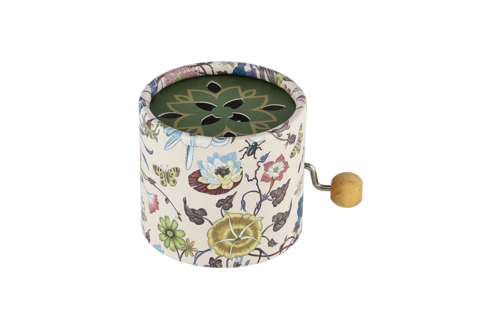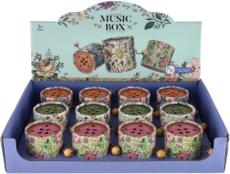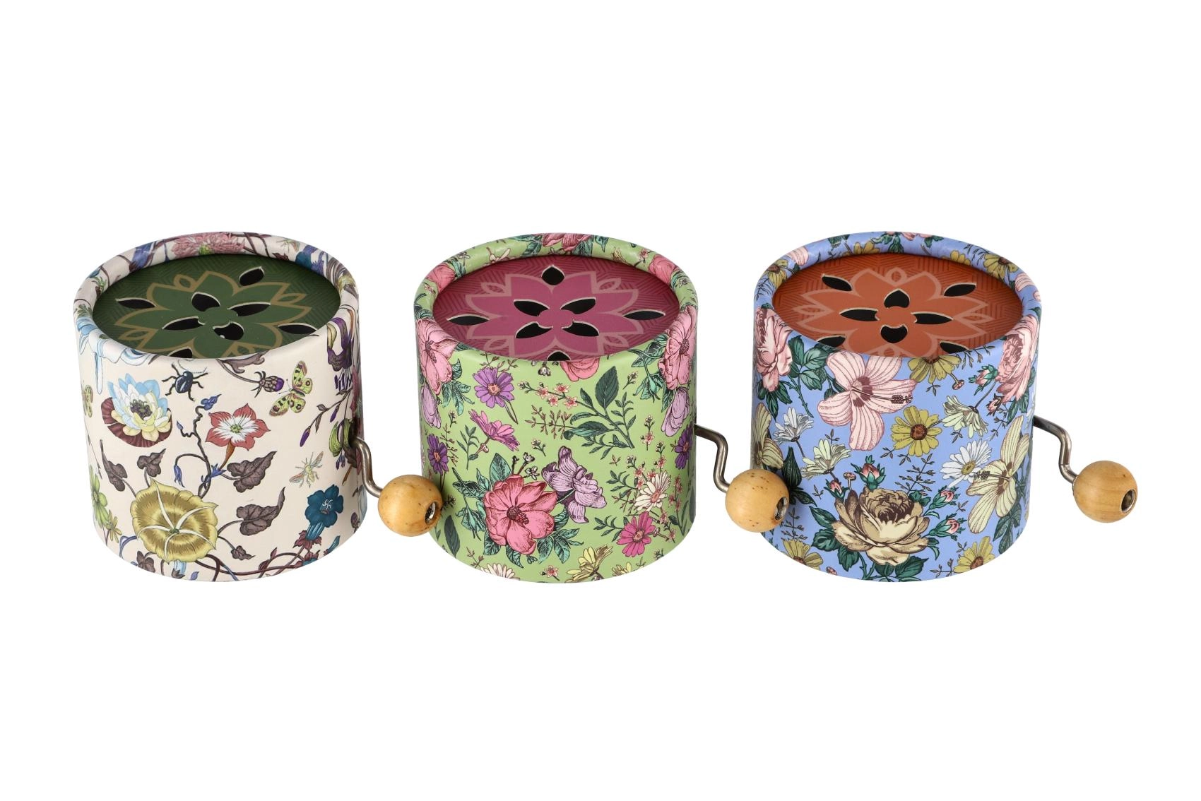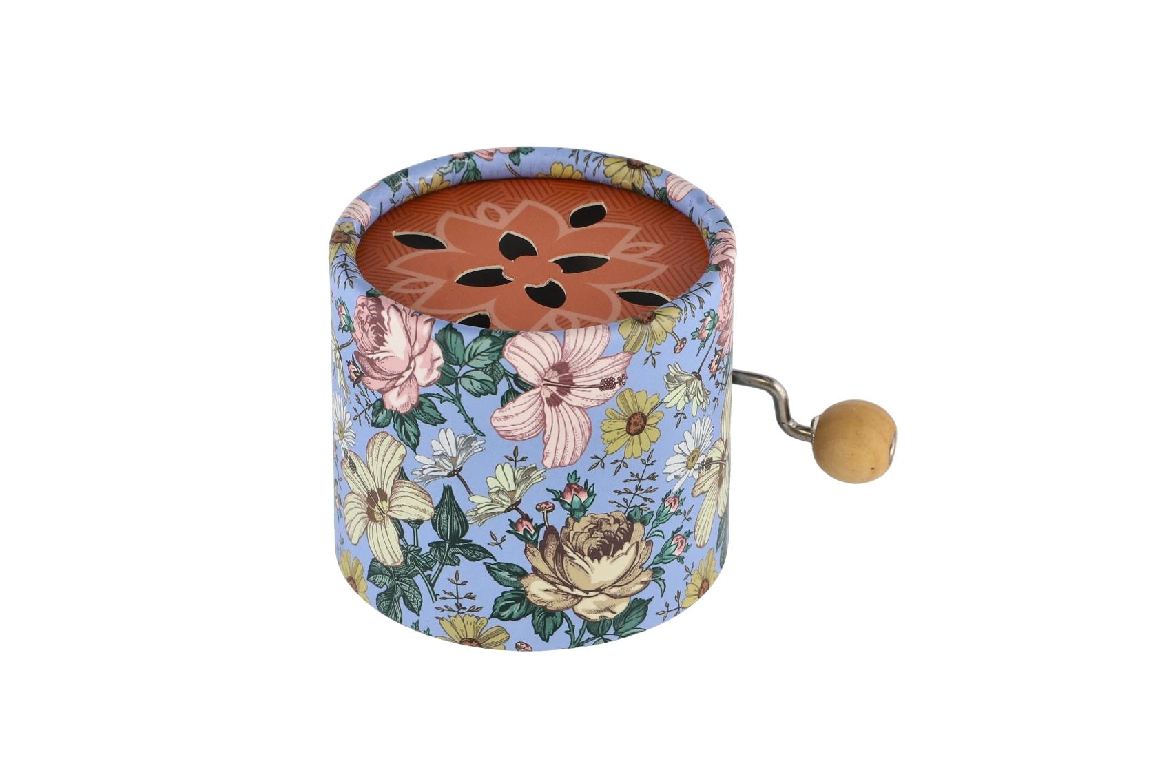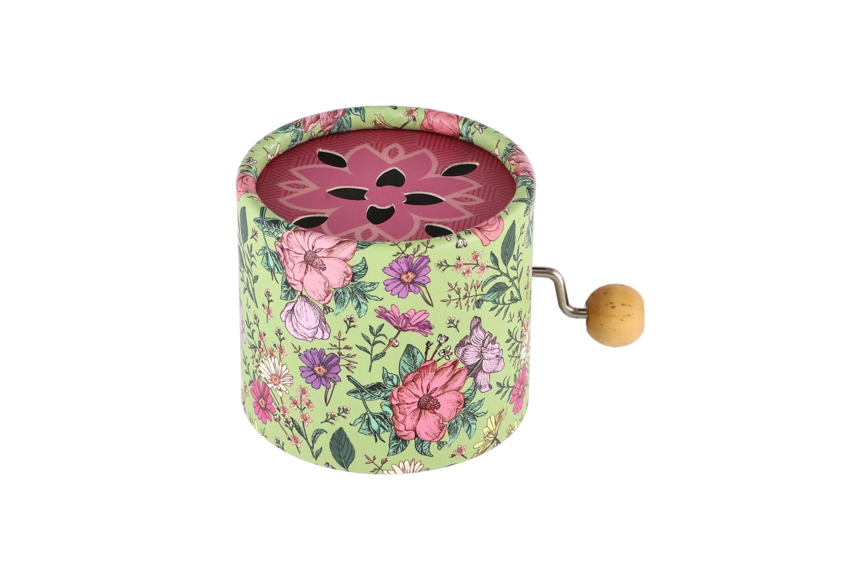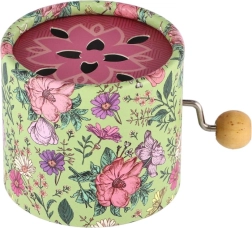 La caja está disponible en varios colores con un decorativo motivo floral. Su mecanismo manual no requiere pilas, por lo que siempre está lista para usar. Recomendada para niños a partir de 3 años.