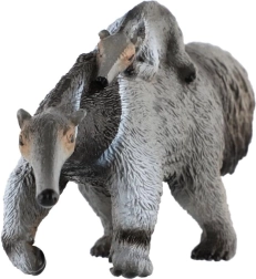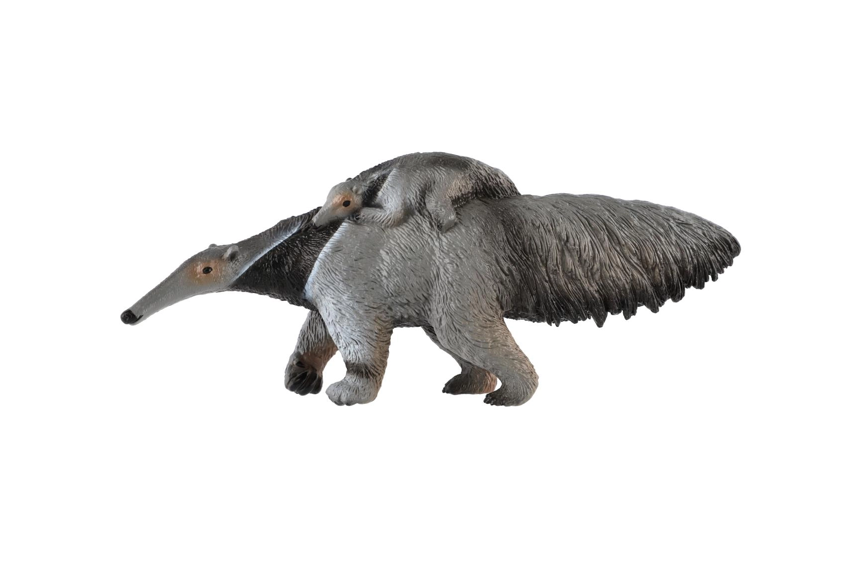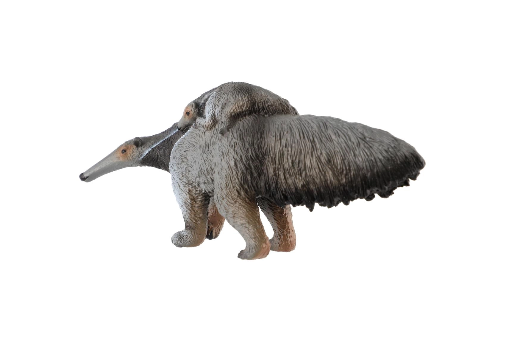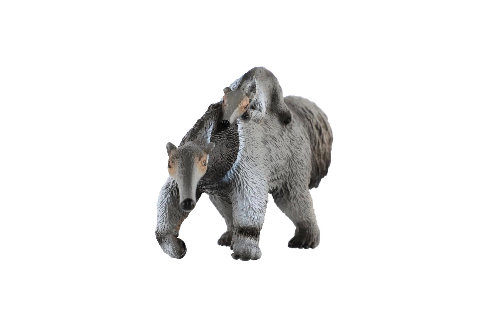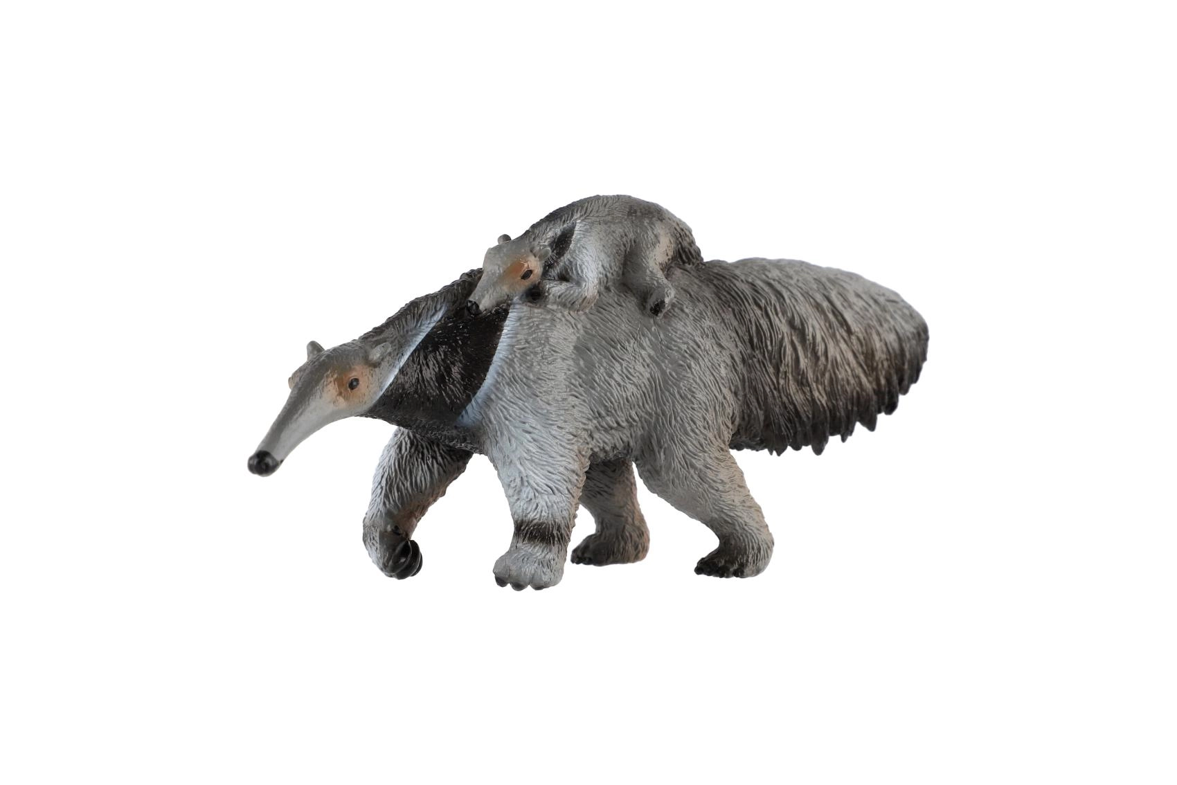 La textura detallada del pelaje, el hocico largo y la cola peluda representan fielmente el aspecto del oso hormiguero gigante con su cría. Ideal para coleccionistas y pequeños zoólogos.