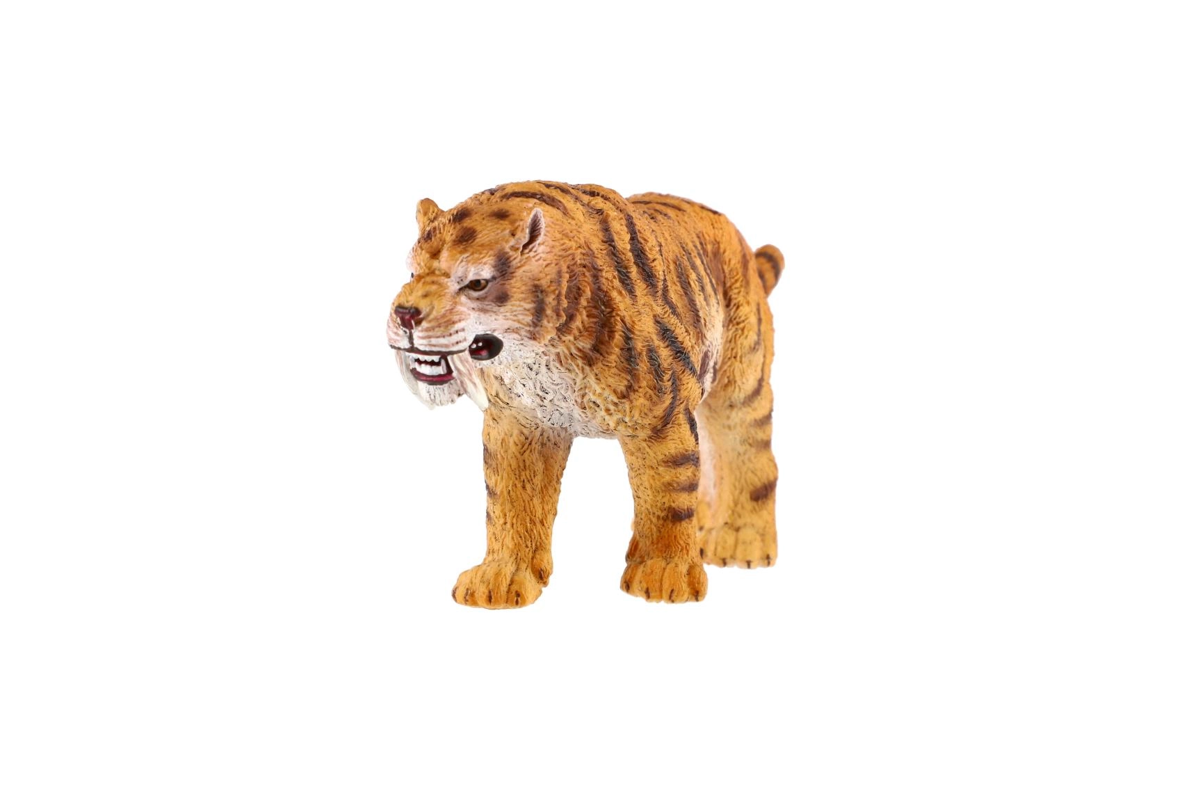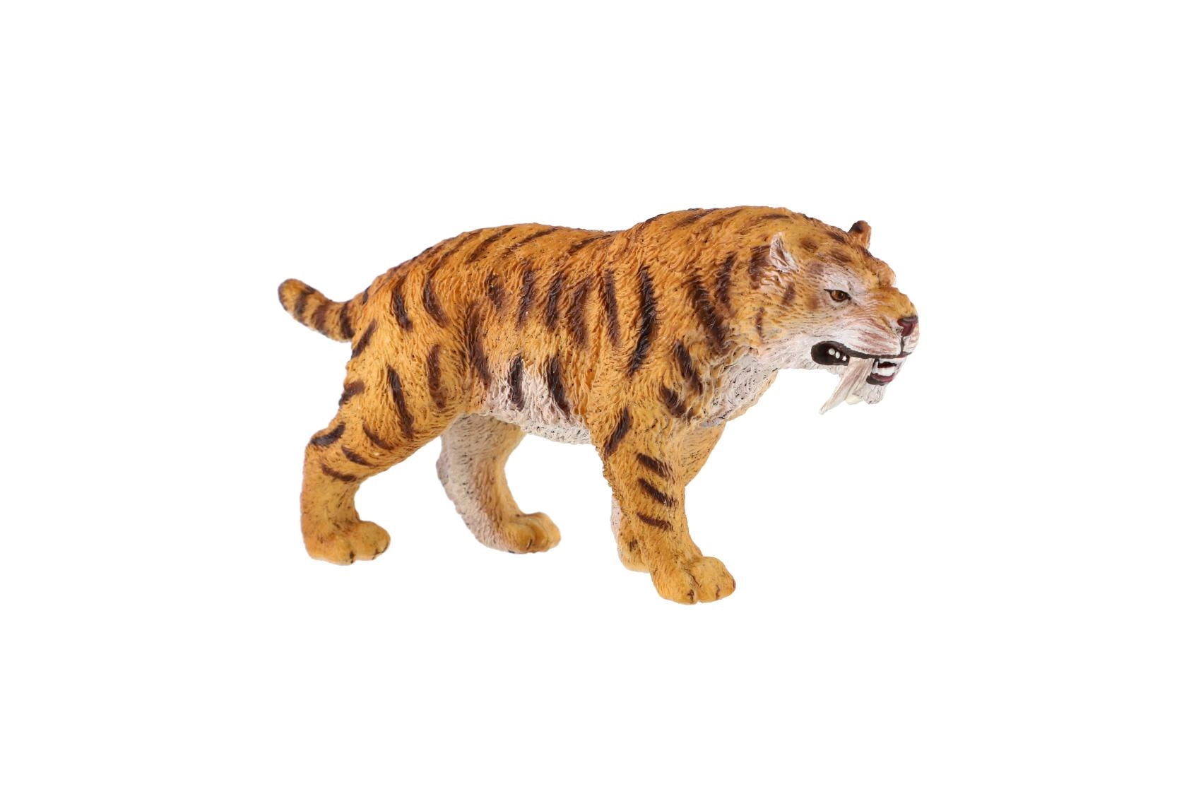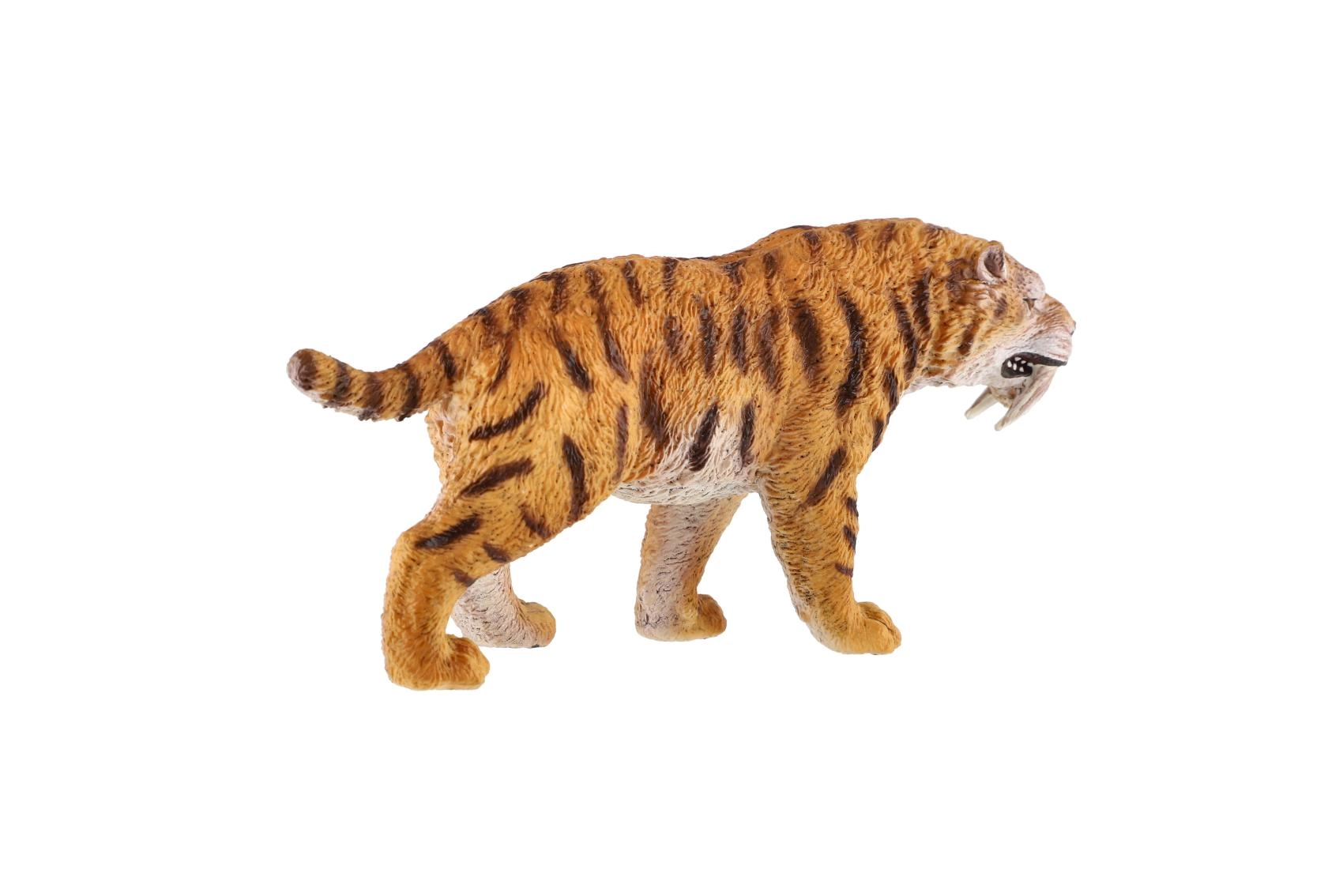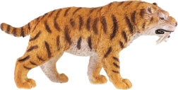 El pelaje texturizado, las rayas naturales y los colmillos prominentes aportan a la figura un aspecto auténtico de un depredador prehistórico.