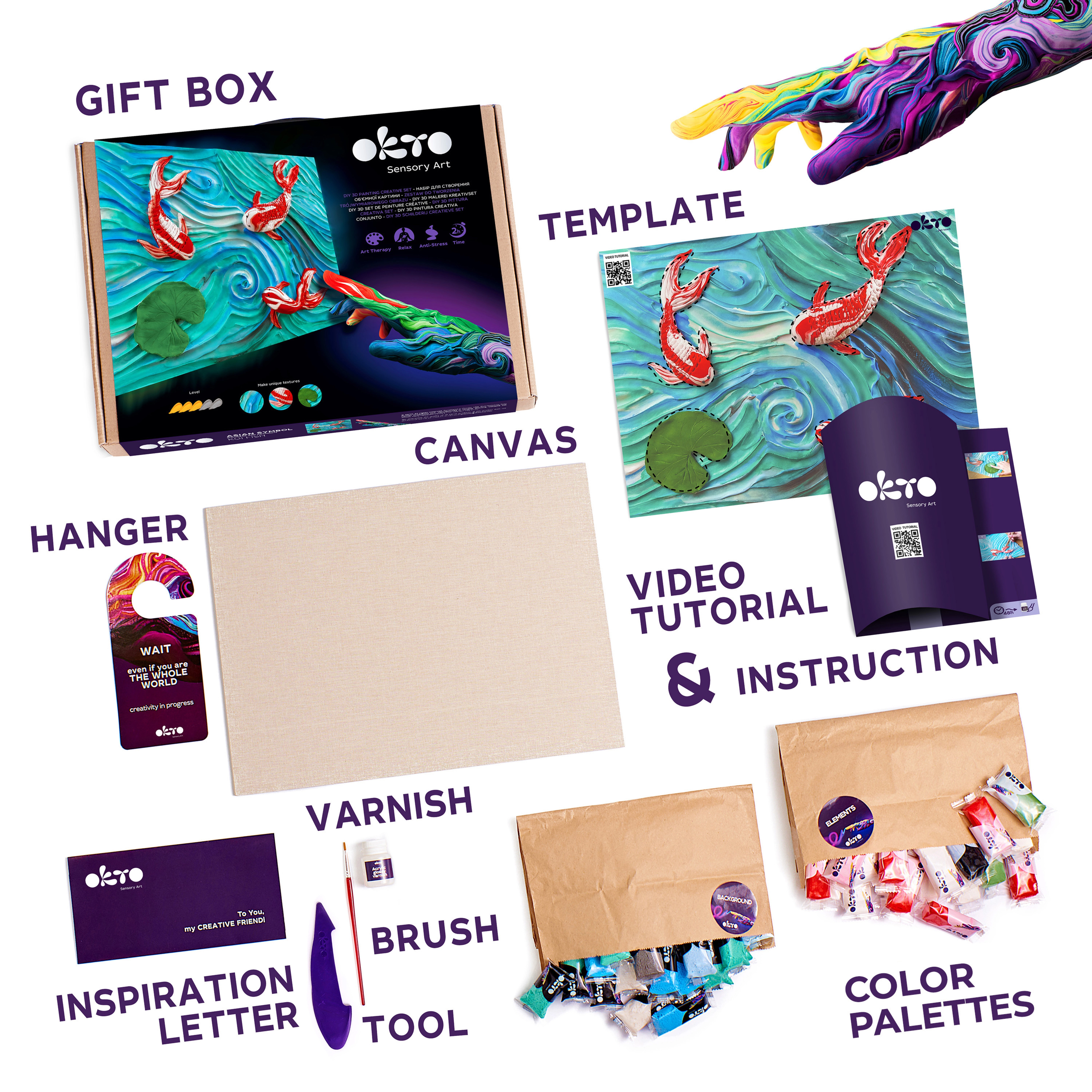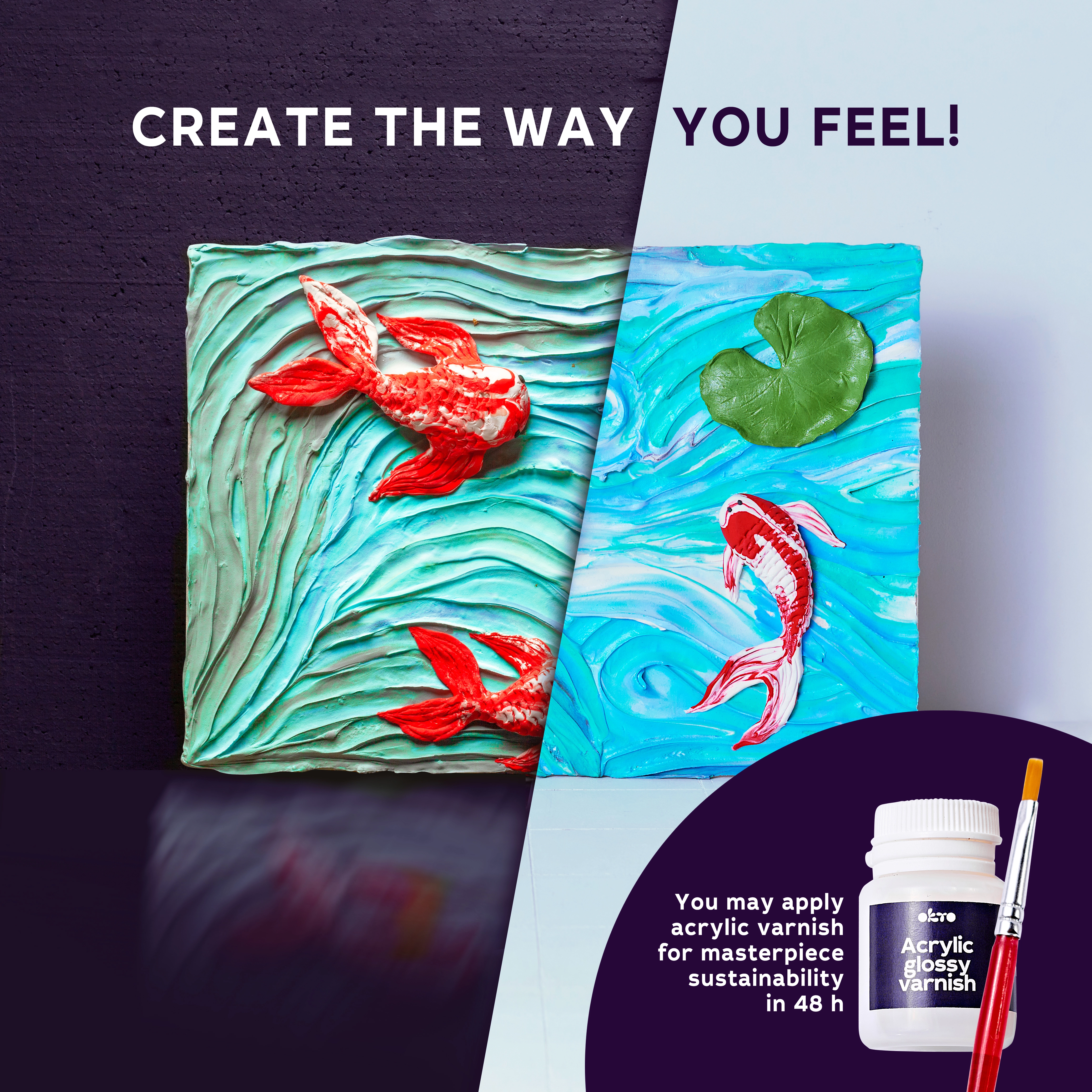 Este set creativo es ideal tanto para principiantes como para avanzados. Gracias a las instrucciones incluidas y a la herramienta moldeadora de madera, crearás un hermoso motivo de carpas koi con una textura llamativa. El barniz acrílico (al agua) incluido aporta resistencia y un suave brillo a la obra terminada.