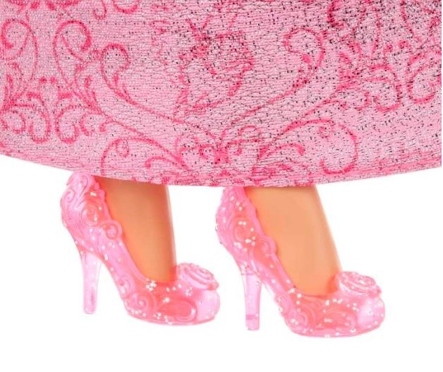 La muñeca viste un vestido rosa con detalles brillantes y adornos que evocan la apariencia de Aurora en la película.